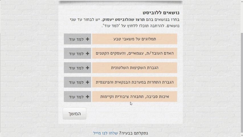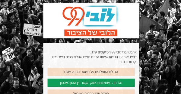 Lobby 99 is a crowdfunded social enterprise which has tasked itself with being the missing link between the public and government. This initiative – the first of its kind in the world – uses crowdfunding to fund a professional lobbyist at the Knesset, The Israeli parliament, who acts to advance the common goals of the general public, as expressed by the votes of the funding citizens.