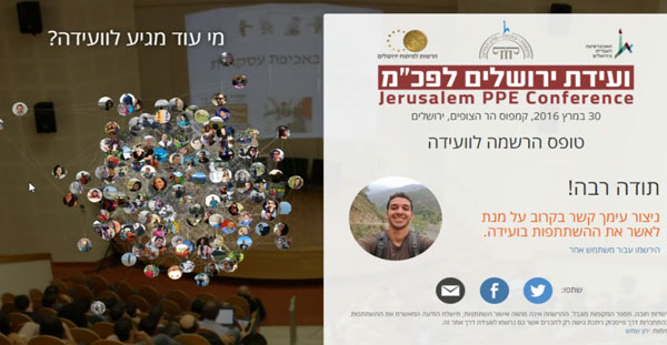 A website that allowed registration for the Jerusalem Philosophy, Politics and Economics (PPE) Conference. The enrolled users are being shown in an interactive way that presents their network of friends who also plan to participate in the conference, using their Facebook connections.