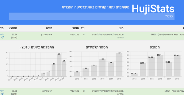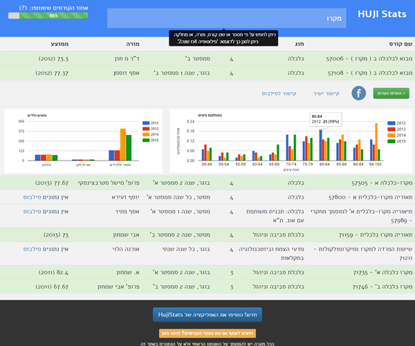 A tool I developed was used by over 20,000 of my college peers during my studies at the Hebrew University of Jerusalem, who logged in to view various statistics about their courses. The statistics were brought together by the power of the crowd, and included: past years’ course grade averages, grade distribution, and standard deviation. These were smartly shared by each student when logging into their personal grade results page on the University website, and then sharing the website data with my tool. The data is automatically verified against publicly available University data such as course lists, and against other student submissions, and hence is highly reliable. The statistics of over 86% of BA courses at the University were shared on my tool.