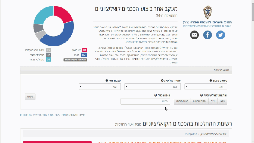 A tool I developed for the Citizens’ Empowerment Center in Israel, which presents the current state of appropriations and spending of the State Budget of the Israeli Government, in an approachable and friendly manner. The tool allows citizens, journalists and policy makers to review which State Budget appropriations have actually been used by the various state agencies, and also allows tracking and analysis of changes to appropriations over time. The data in this tool is extracted from raw databases available on the official Ministry of Finance website.